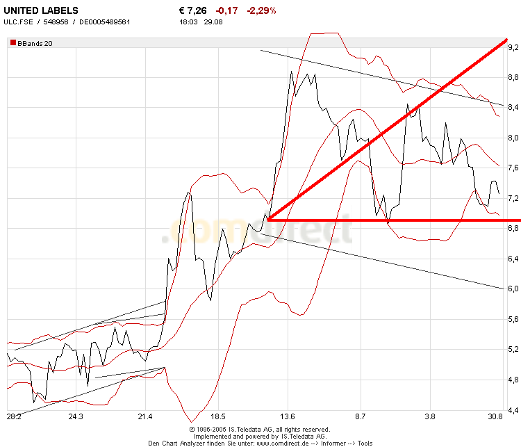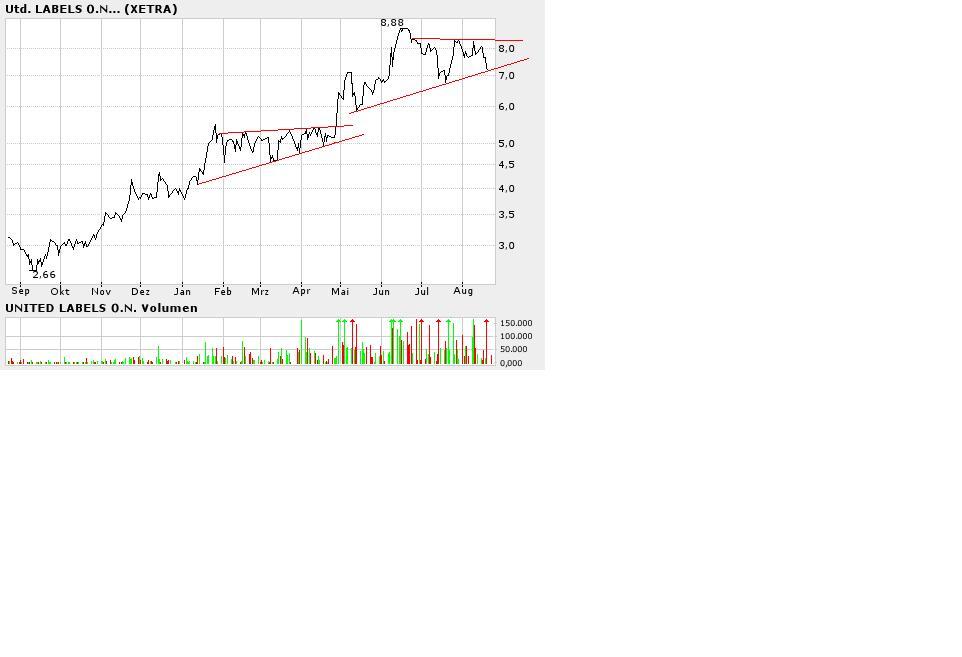 Momentan befinden wir uns in einen leichten Abwärtstrend, was bei dieser Perf. auch nicht weiter verwunderlich ist. In solchen Momenten sollte man einfach auf die fundamentale Seite schauen und schaut es einfach klasse aus. Alleine die am Markt vorherrschende Unterbewertung bzügl. des Eigenkapitals/Börsenbewertung, sollte der Markt die nächste Monate aufholen also steigt in diesem Moment die Aktie noch ohne, dass Utd. Labels was vollbringt. Die Expansion mit Geschäftstellen, die in diesem Jahr massiv voran getrieben wurde, sollte sich im Umsatz/Gewinn in den nächsten Monaten massiv niederschlagen. Mein Kursziel bis Mrz ´06 --- 15,00 € wobei da noch nicht der Deckel liegt ...