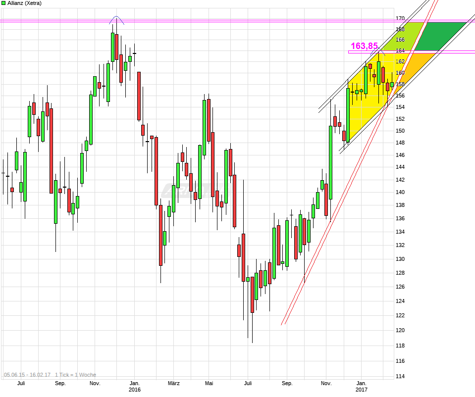 eigentlich so gut wie feststand, daß ein Aktienrückkaufprogramm in der Art durchgeführt wird, ist es natürlich besser es ist jetzt auch final durchgewunken. Schon am 5.1. 2017 war quasi zu lesen was nun kommt ( =>05.01.2017 http://www.boerse-online.de/nachrichten/drucken/...sollten-1001553382 ). War somit eigentlich schon Anfang Januar angekündigt worden und mußte jetzt nurnoch auf der nächsten AR Sitzung durchgewunken werden. Die war bekanntlich auf Mitte Februar terminiert. Von daher nicht überraschend der Zeitpunkt der Meldung heute, außer für jemanden der sich wochenlang zuvor Augen und Ohren zugehalten hätte. Zumal ja auch der AR-V inzwischen exCEO Diekmann ist und dieses Versprechen mit dem ARP (wenn bis Ende 2016 kein Übernahmeobjekt feststeht) von Diekmann stammte. Wäre also ein schlechter Witz gewesen, wenn ausgerechnet von der AR-Seite irgendwas dagegen noch gekommen wäre. Und Bäte macht natürlich nichts was dem AR-V Diekmann nicht gefällt, wenn er seinen CEO Posten noch etwas länger behalten will. Zumal Bäte bekanntlich jetzt schon einige interne Feinde in dem Unternehmen hat. Von daher ist das ARP wohl zu einem Teil auch schon vorher eingepreist worden. Sollte man auf Xetra morgen einen Freundenhüpfer zur Eröffnung machen, dann muß man schauen, ob der nicht vielleicht um die 163,85 schon wieder etwas eingebremst wird und man das Eröffnungsgap danach vielleicht nochmal schließen wird. Wobei das wohl auch wohl nur passiert, wenn auch der DAX nochmal etwas zurückkäme. Wie dem auch sein, nicht vergessen sollte man, daß natürlich den Kurs beeinflussen wird wie die Zahlen für das Gesamtjahr 2016 sind, wie die weiteren Prognosen für 2017 aussieht, wie die möglichen Absichen von Bäte irgendwelche übertrieben hohe Summen noch zu verballern für Zukäufe (was dem Kurs dann nicht so gut täte) und was macht der Gesamtmarkt weiter (weil die Allianz nurmal die meiste Zeit doch eher ein passiver Dackel ist der dem Markt folgt). Sollte alles solide verlaufen, keine Großschadensereignisse eintreten und der DAX vielleicht nochmal die kommenden Wochen etwas zulegen, dann wäre der nächsthöhere horizontale Widerstand bei ca. 170€ ein möglicher Anlaufbereich auf dem Weg Richtung HV. Da eben die Zinsen noch immer sehr niedrig sind bei uns und dies Versicherungen wie die Allianz noch immer klar mitbelastet, sind Versicherungen wohl weiterhin weniger die Outperformer unter den Branchen. Da ist es also nicht schlecht, wenn wenigstens durch das ARP nun etwas mehr Nachfrage nach der Aktie temporär aufkommen wird.