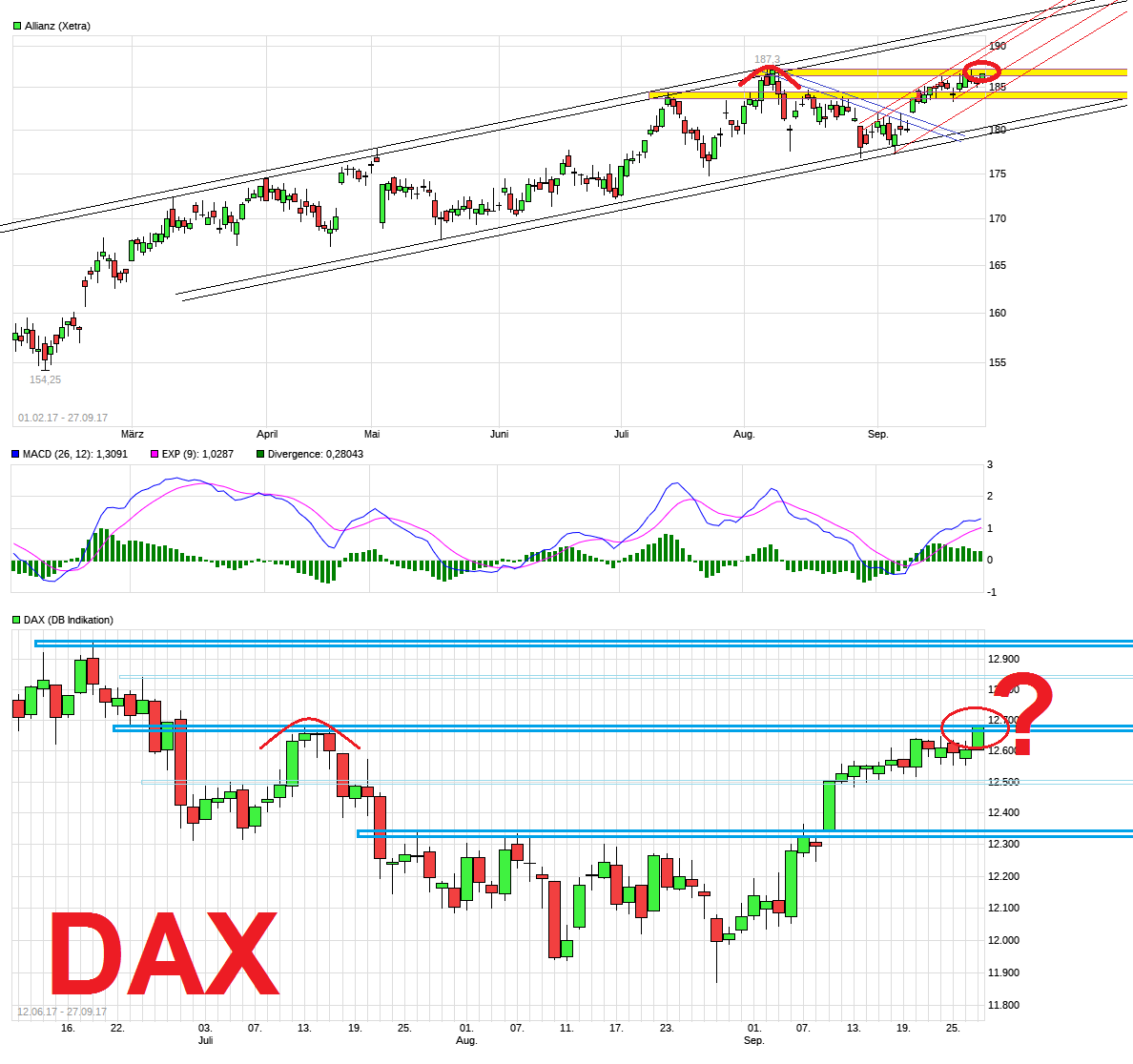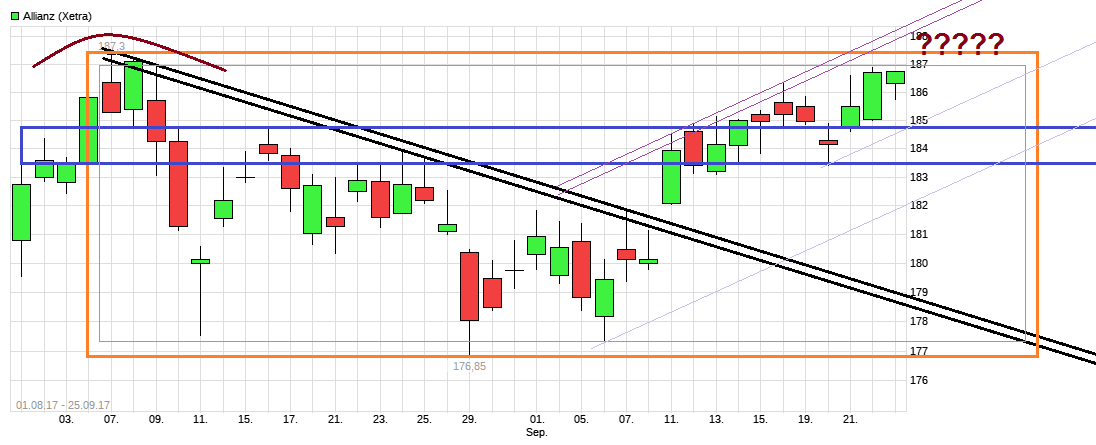 heute die Märkte nicht einknicken läßt. Allianz ist wieder zurückgelaufen an die ehemalige Widerstandsregion von ca. 183,5/184,5. Sollte man hier auf SK klar darunter zurücklaufen anstatt nur nochmal einen Pullback zu machen, dann wäre das wenig chartbildaufhellend. Dann müßte man eventuell auch noch damit rechnen, daß man das jüngste offene Gap auch noch schließen will. Die Allianz braucht als Treibstoff mehr Hinweise, daß die Notenbanken die Geldpolitik straffen. Draghi war im September noch verbal im Leerlauf. Da muß man schauen, ob man nach der Merkel-Wahl endlich sagt die Anleihekäufe werden gedrosselt. Und was Yellen sagt bleibt auch abzuwarten. In den letzten Wochen ist jedenfalls zunehmend der Eindruck entstanden die FED schieb den nächsten Zinsschritt weiter raus, d.h. frühestens Ende 2017 oder gar erst wieder 2018. Schauen wir also mal was Yellen heute wirklich sagt (und wie €/$ reagiert), was Draghi in wenigen Wochen sagen wird und ob es dem ALV Kurs hilft oder schadet. Rücktritt des Deutschland-Chefs bei der ALV gestern als Meldung und Erdbeben in Mexiko sind auch nicht gerade Dinge die besonders nützlich sind für das Sentiment. Bleibt wenigstens zu hoffen die restliche Hurrikan Saison bleibt halbwegs friedlich an den US-Küsten.