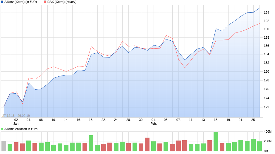 Heute ist die Allianz erstmal an der Oberseite des kursfristigen Aufw.trendkanals angekommen und zudem am horizontalen Widerstand im Bereich um 194,66 auf SK gescheitert. Die Widerstände wollen auch erstmal genommen werden. Selten gelingt es im ersten Anlauf. Indikatoren sind auch schon wieder kurzfristig in überkaufte Regionen gelaufen. Von daher zwar denkbar man "quält" sich jetzt noch etwas zäh am oberen Kanalrand weiter Richtung nächsthöherem Widerstand bei 197,50 , wenn der DAX auch noch mitzieht. Aber es wäre auch wenig verwunderlich wenn man irgendwo im Bereich von ca. 191/195 erstmal etwas "wassertreten" betreiben würde und abwartet was die nächsten Tage alles passiert bzw. wie es nach dem 1. März weitergeht, der ja mal der große Stichtag war für weitere Verschärfungen. Denke sobald ein konkreter Termin für ein Treffen mit Trump und dem chinesischen Präsidenten verkündet würde, wäre klar der Deal ist in trockenen Tücher. Bis dahin ist vermultich die Luft nach oben erstmal jetzt dünn, da durch den starken Anstieg seit Jahresanfang auch die Fallhöhe schon wieder deutlich angestiegen ist und man den Flop von Anfang Dezember nicht vergessen hat. Denke aber Trump und China haben endlich erkannt, daß man in die Gänge kommen muß mit einer Einigung, da China und die Weltkonjunktur schon klar anfangen die wirtschaftlichen Auswirkungen zu spüren und dies verzögert auch auf die USA zurückschlagen dürfte. Von daher könnten beide Seite es als Win-Win Situation nach außen verkaufen, wenn man sich einigt. Daher sehe ich für die Allianz-Aktie erstmal noch gute Aussichten sich bis zur HV in Richtung von ca. 206 weiter zu bewegen, wenn wie gesagt die Politik ihre Hausaufgaben macht und Schadensgroßereignisse ausbleiben.