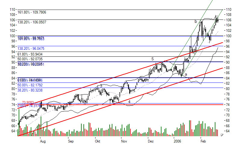 Kurz- aber auch mittelfristig zählt der Kurs der Deutschen Börse AG zu den Topperformern am Markt. Knapp 8% in zehn Tagen, 36% in 100 Tagen... beim DAX sind es 3% bzw. 17%. Mit 8% über dem 35-Tage-Durchschnitt bewegt sich der Kurs derzeit im oberen Bereich seines Aufwärtstrends, der Relative Stärke Index 15-Tage notiert bei 62 Punkten, s.a. http://www.traducer.de/star/include/aiux_c.htm Der Kurs ist damit technisch leicht überkauft, liegt aber andererseits deutlich "im Trend"...