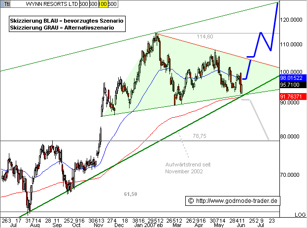 Wynn Resorts - Kürzel: WYNN - ISIN: US9831341071 Börse: Nasdaq in USD / Kursstand: 95,71 $ Kursverlauf vom 21.06.2006 bis 08.06.2007 (log. Kerzenchartdarstellung / 1 Kerze = 1 Tag) Rückblick: Die WYNN Aktie befindet sich in einer steilen, langfristigen Kursrallye. Das AllTimeHigh markierte sie bei 114,60 $ im Februar 2007 und startete eine Zwischenkorrektur, welche auf hohem Niveau in einem Dreieck seitwärts verläuft. Im Zuge des marktbreiten Abverkaufs in dieser Woche erreichte die Aktie gestern fast die massive Kreuzunterstützung bei 91,77 - 92,30 $, wo Dreiecksunterkante, Aufwärtstrend und EMA200 zusammenfallen. Heute springt die Aktie wieder deutlich nach oben. Das kurzfristige Chartbild ist absolut neutral zu werten, das langfristige ist sehr bullisch.