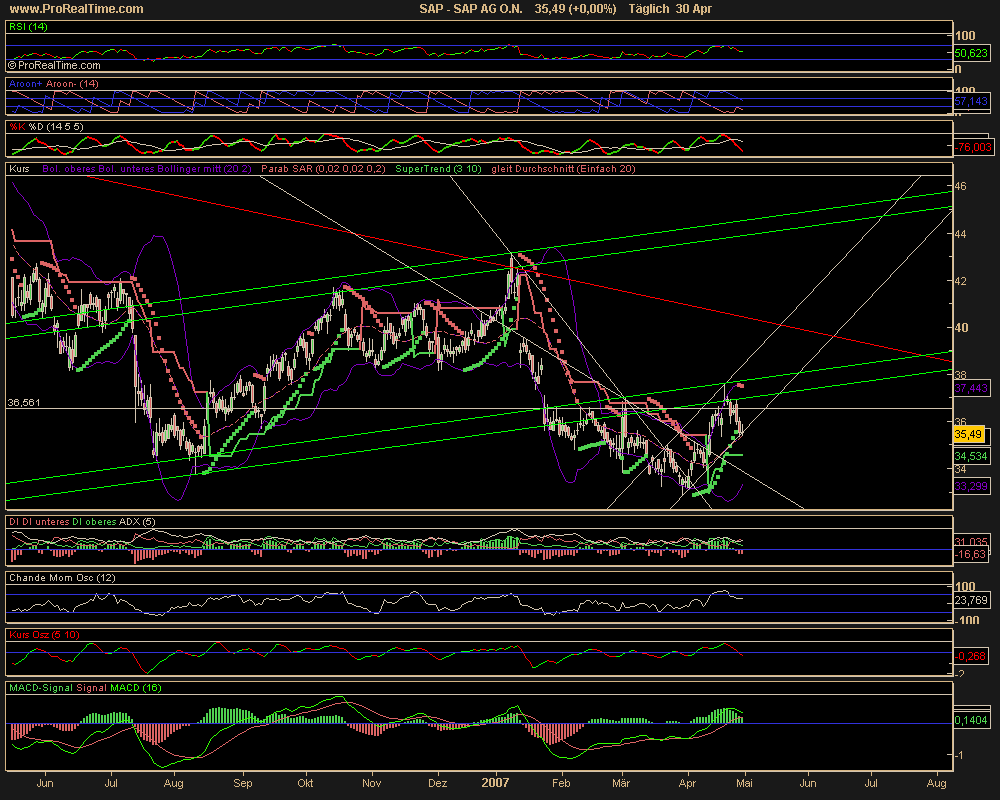 Nachbörslich hat Sap am Montag weiter verloren, außerbörslich sogar kräftig, steht jetzt bei 35,14. Und auch an der Wall Street fällt der Kurs derzeit gegen den Trend. Morgen wird Sap unter 35 notieren, davon bin ich überzeugt. Und wenn dann noch die Berichtssaison der anderen Dax-Unternehmen beendet ist und eine weitere Korrektur einsetzt wegen ausbleibender Impulse wird es überdurchschnittlich abwärts gehen. Sap ist sicher eine Anlage wert, aber nicht um schnelle Gewinne realisieren zu wollen. Ich empfehle jetzt aus- und bei unter 30 wieder einzusteigen. Mit dem Sprung auf 40 Euro wird es in diesem Jahr nichts mehr.