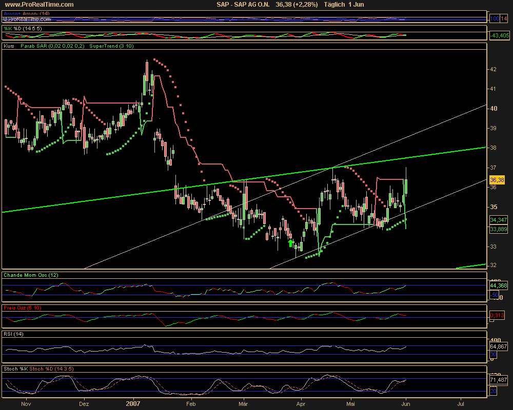Ich wage daher auch mal eine Prognose: die Amis schließen heute rot und SAP wird wohl kurz unter 37 wieder nach unten abprallen and zurück in den 35´er Bereich taumeln. Bin zwar kein Linienmaler, aber mein Gefühl sagt mir, dass das wahrscheinlicher ist, als ein Flug über die 37. Möglich wäre es natürlich, aber nur, wenn die Amis heute mitziehen und genau das bezweifle ich ein wenig.