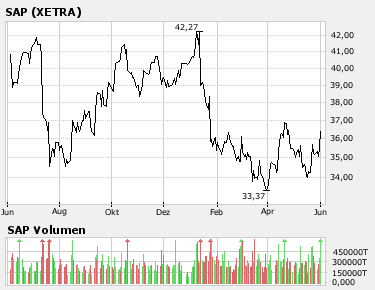 Den Anstieg der vergangenen zwei Wochen haben wir nahezu ausschließlich unbestätigten Übernahmegerüchten zu verdanken. Ich hatte gehofft, dass sie übers Wochenende neue Nahrung bekommen. Stattdessen tritt das Gegenteil ein. Oracles Anschuldigungen müssen nicht stimmen, plausibel klingen sie allemal, und das reicht, um dem Kurs wieder einmal einen kräftigen Dämpfer zu verpassen. Wenn dann auch noch eine Korrektur für den Gesamtmarkt einsetzt, sehe ich bald wieder eine 33 vor dem Komma. Mittelfristig rutscht die Aktie sowieso wieder auf unter 30, weil es bis Anfang nächstes Jahres keine fundamentalen Impulse geben wird. An irgendwelchen Gaps wird sich das Papier jedenfalls nicht orientieren. Chartverläufe können einen Trend verstärken, ihn aber nicht auslösen. Von daher ist es schlichtweg naiv, allein daraus einen Aufstieg abzuleiten. Was die Quartalsberichte im Juli und Oktober betrifft, sehe ich eher schlechte als gute Nachrichten. Es wird noch eine Weile dauern, bis wir wissen, ob sich die neue Strategie mit Mittelstandssoftware und dem "Wachsen aus eigener Kraft auszahlt". Bei Erfolg allerdings kann sich das Papier lässig auf 60 oder 70 hochschrauben. Sollten die Erwartungen allerdings nicht erfüllt werden, wird Sap deutlich unter 30 bleiben, und zwar auf Jahre.