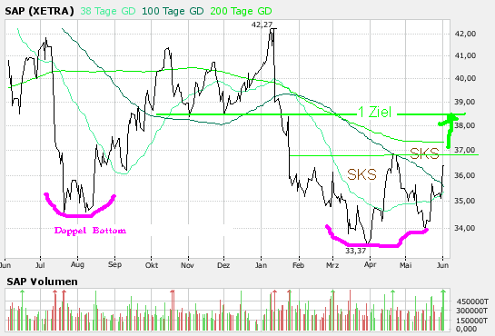 Charttechnischer Ausblick: Die SAP Aktie hat nun die Chance auf eine mittelfristige Bodenbildung und eine deutliche Kursrallye. Steigt sie jetzt per Tages- und Wochenschluss über 35,87 Euro an, sollten direkte Gewinne bis 37,35 Euro erfolgen. Ein signifikanter Anstieg über 37,35 Euro generiert ein mittelfristiges Kaufsignal und eröffnet Aufwärtspoztenzial bis 39,48 und 42,89 Euro. Unter 34,80 drohen weitere Abgaben bis 33,75 Euro. Erst ein nachhaltiger Rückfall unter 33,75 Euro legt das bullische Szenario einer mittelfristigen Trendumkehr nach oben hin zunächst auf Eis.