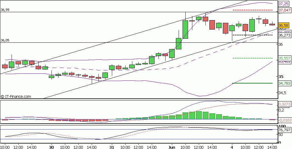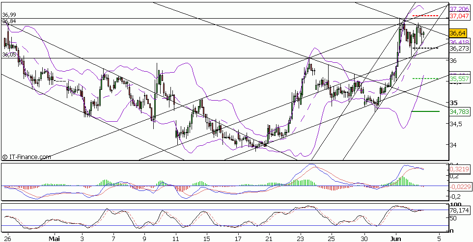 Hier mal ein wenig längerfristiger hourly Chart. Könnte durchaus nochmal unter 36.40 gehen und auf den flacheren Trend (bei 36.10) gehen? Meinungen dazu? Andererseits möchte ich nicht verpassen, was über 37 Euro passiert... =)