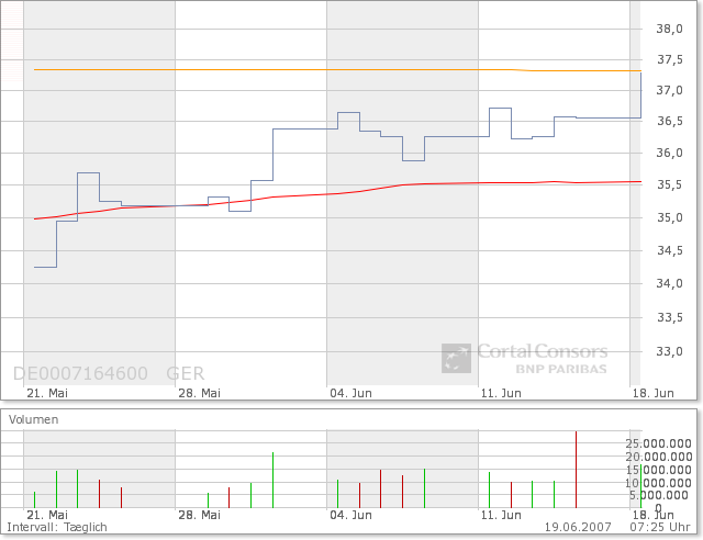 Unsere Meinung: Solange 36.75 EUR nicht unterschritten werden, erwarten wir eine Aufwärtsbewegung mit 38.5 EUR und dann 39.5 EUR als nächste Kursziele.