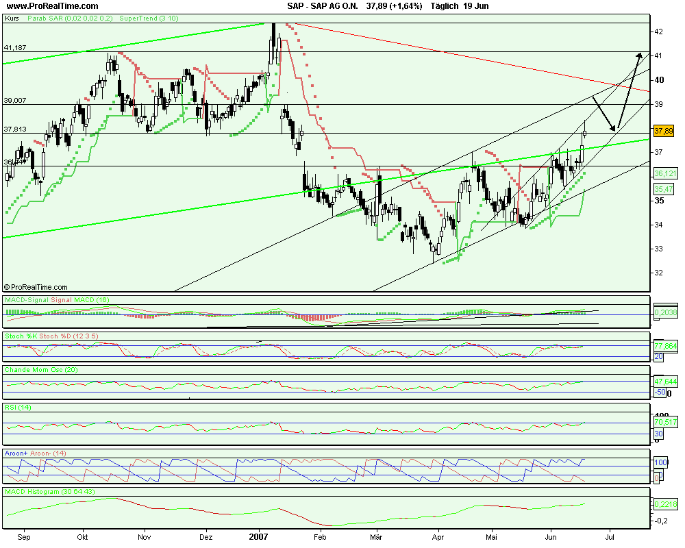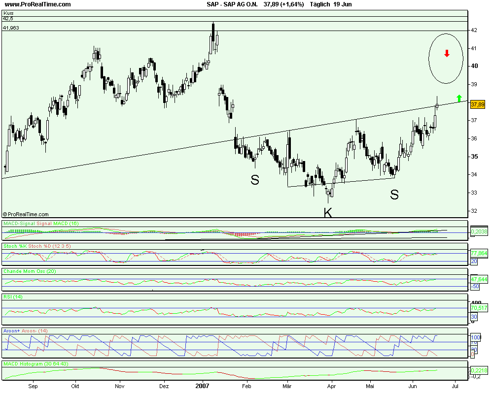 Schön anzusehen wie die Amis wieder die Futures mitziehen und alles steigt...Ich denke wir haben morgen die besten Chancen über 38.30Euro zu kommen. Ich denke ebe wie auch Semi das denkt ,das nun aus Sicht der Charttechnik viel nachzuholen ist. JEtzt steht SAP bei 38,08 und das ist wirklich sehr ernorm. Diese 38 ist wirklich toll anzusehen ! Wie sieht das erst bei 40 aus oder beie 50....Due Ausbruchsignale sind da und die Märkte zeigen im moment wirklich Stärke auf , nur fehlen Teilweise die Impulse die den Dax beflügeln. Hoffen wir also morgen mal das die SAP soweiter performt und uns ein grinsen ins Gesicht zaubert. Semis OS _ Schein ist ideal! ....