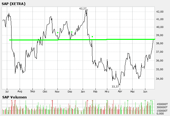 Schon seit einigen Tagen habe sich angedeutet, dass das Wertpapier die Hürde bei 37,50 Euro testen würde. Am Montag sei es dann soweit gewesen. Nachdem die Marke übertroffen worden sei, seien vermehrt charttechnisch motivierte Kauforders in den Markt gekommen, die den Aktienkurs weiter nach oben getrieben hätten. Auf dem vorläufigen Tageshoch von 37,81 Euro habe die SAP-Aktie 3,4% im Plus notiert. Eine Nachricht, mit der man den Kursschub hätte erklären können, habe es nicht gegeben. Die Charttechnik dürfte daher der einzige Grund gewesen sein. Die Experten vom "Frankfurter Tagesdienst" hätten bereits in der vergangenen Woche wiederholt zum Einstieg geraten. Jetzt dürfte sich die Aufwärtsdynamik weiter verstärken.
