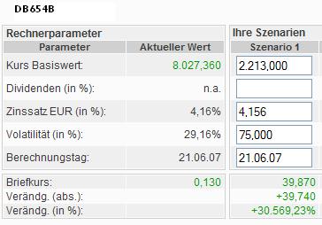 2213 des Dax hat mir keine Ruhe gelassen und ich habe mal meinen Crash-Protect-Schein DB654B durch den Onvista-Rechner laufen lassen. Bei dem angenommenen Kursrückgang des Dax von 71% war ich mal so frei, eine imlizierte Volatilität von 75% anzunehmen. Nunja, bei dem Ergebnis wäre wohl mein KO-Call auf SAP wertlos verfallen, aber der Crash-Protect-Call würde das mit seinen 30.000% plus einigermaßen wieder gut machen ;-)) Ich werde dann schon mal mein Kündigungsschreiben vorbereiten...