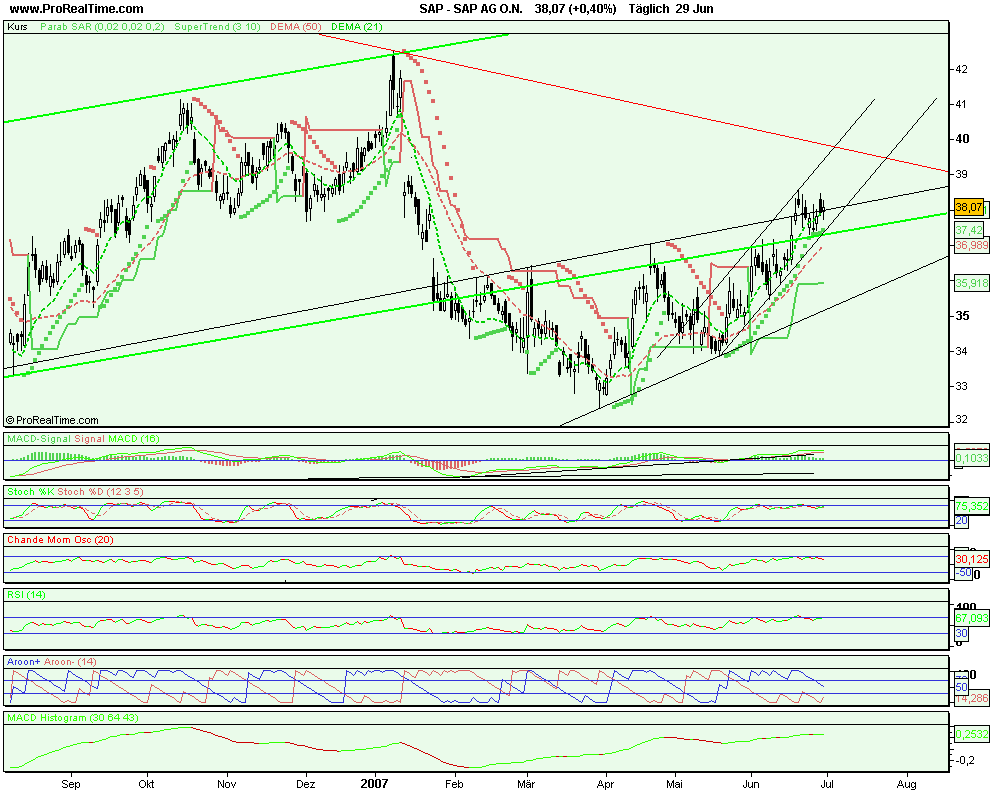 Auf dem Papier lastet ein negatives Sentiment. Der Kurs konnte sich im letzten Quartal nicht gut entwickeln, vergleichbar SAP. Es gibt ein negatives Sentiment. Die Aktie wird durch Bear Stearns, die schlechte Bewertung des europ. Bankensektors durch Dresdner Kleinwort gedrückt. Das Sentiment für SAP ist auch schlecht.