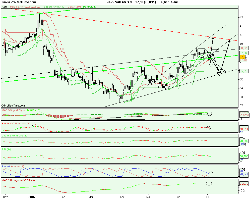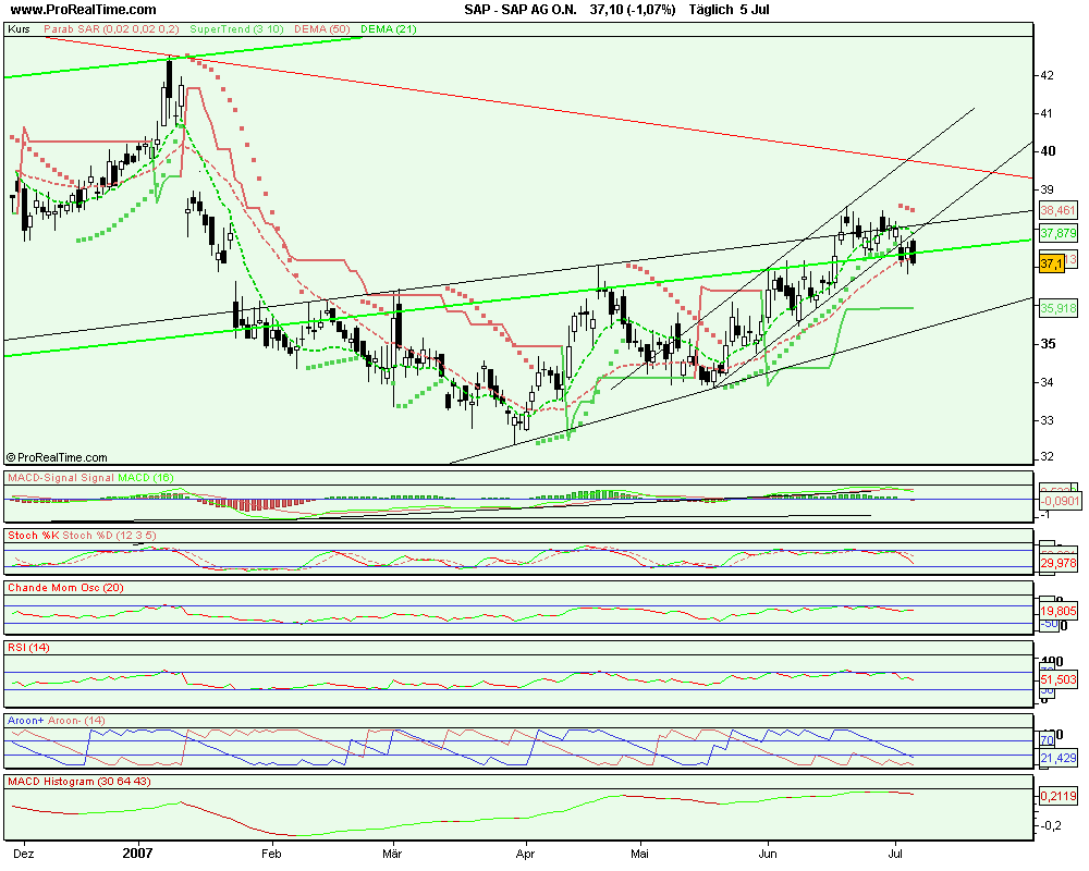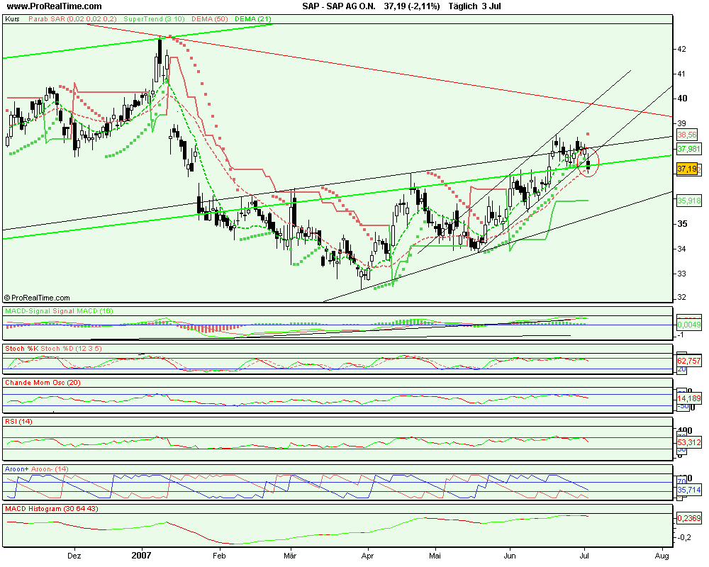 Gerade nach der jüngsten Entwicklung ist SAP ein klarer Favorit in den nächsten Wochen. Trotz schlechter Nachrichten nur eine kleine Delle... Die 37 hat sich, nachdem sie ein paar Tage ein Widerstand war, nun als Unterstützung entpuppt.