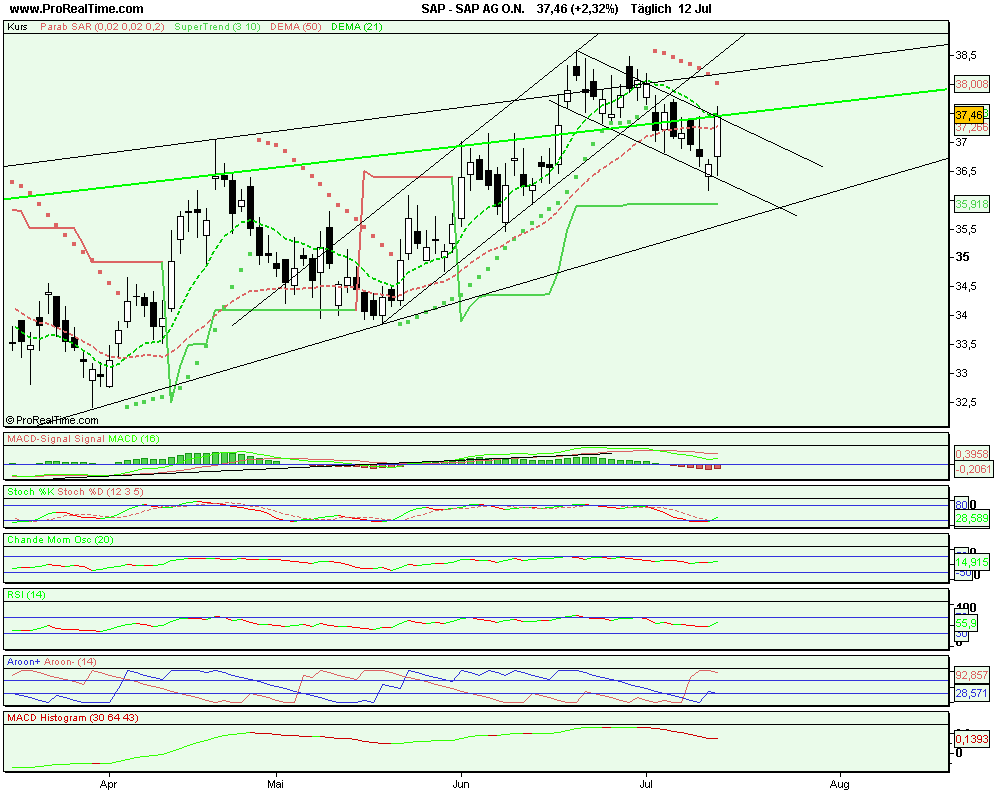 Charttechnischer Ausblick: So lange die SAP Aktie per Tagesschluss oberhalb des Unterstützungsbereichs der exp. GDL (EMA50, EMA200) bei aktuell 36,64 - 36,92 Euro notiert, sind tendenziell steigende Kurse zu erwarten. Steigt die Aktie jetzt per Tages- und Wochenschluss über 38,85 Euro an, wird ein Kaufsignal mit Zielen bei 42,89 und darüber 47,69 Euro ausgelöst. Fällt sie hingegen per Tages- und Wochenschluss unter 36,60 Euro zurück, wird eine Abwärtsbewgung bis 35,45 und darunter ggf. sogar 33,75 Euro wahrscheinlich.