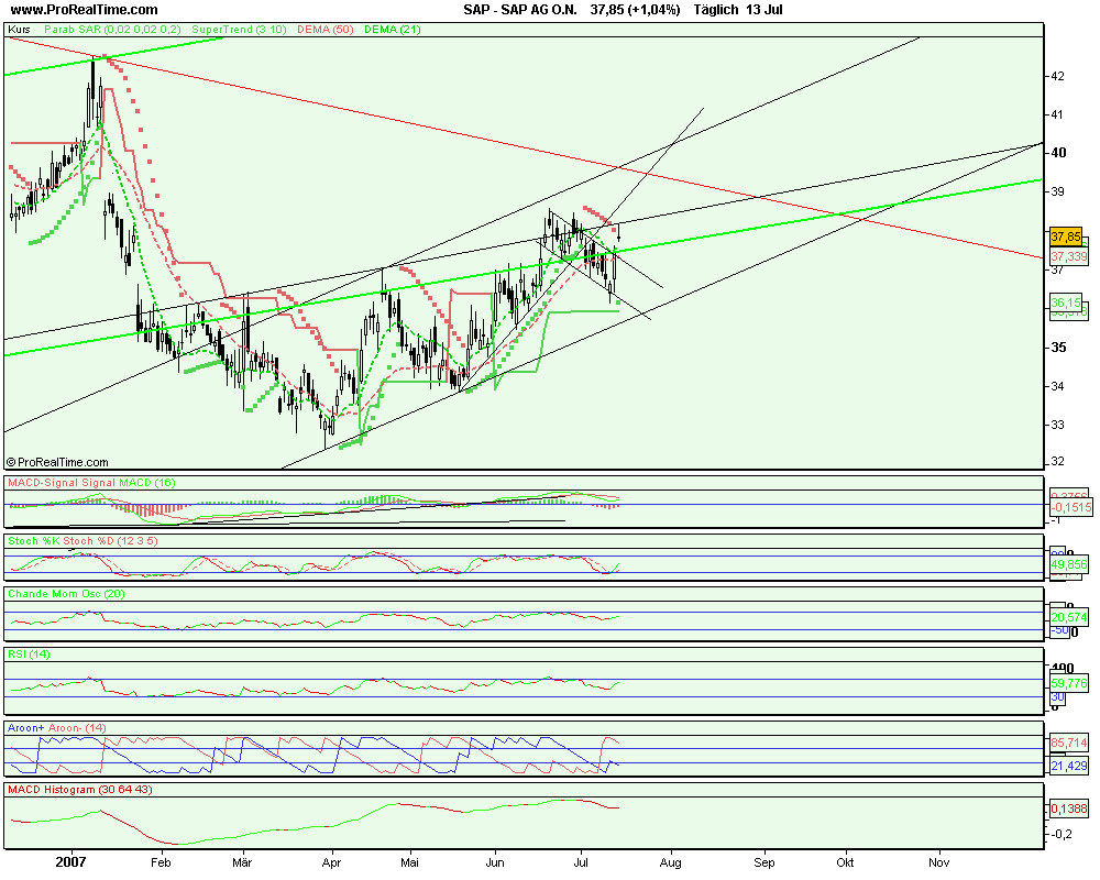 Rückblick: Die SAP Aktie markierte Anfang April 2006 ein Hoch bei 47,69 Euro und fiel danach auf 33,75 Euro ab. Dieses Tief durchbrach die Aktie kurzzeitig im März 2007, erholte sich dann aber schnell und kletterte wieder über die exp. GDL (EMA50, EMA200). Nach einem Zwischenhoch bei 38,56 Euro im Juni vollzog die Aktie eine Abwärtskorrktur und vollzog in dieser Woche einen Härtetest des Unterstützungsbereichs der exp. GDL (EMA50, EMA200). Dieser verlief erfolgreich, die Aktie prallt aktuell dynamisch nach oben hin ab. Das kurzfristige Chartbild ist neutral mit bullischer Tendenz.