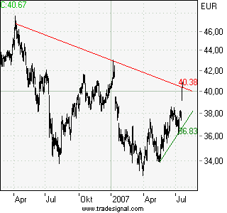 Ausblick: Nachdem der Anteilsschein im Juni dieses Jahres seine Bodenbildung abschließen konnte, gelang gestern die Zurückeroberung der 40 Euro-Marke. Mit diesem sehr dynamischen Impuls, der zudem ein Gap öffnete, gelang es nun, dem kürzerfristigen Abwärtstrend, resultierend vom Zwischenhoch bei 47,69 Euro aus dem April 2006 zu entrinnen. Damit wurde weiteres Aufwärtspotential aktiviert, das den Kurs nun in Richtung der nächsten Widerstände bei 41 und 42 Euro tragen sollte. Gelingt danach ein signifikantes Durchbrechen nach oben, so liegt das nächste Kursziel im Bereich des ehemaligen Zwischenhochs bei 47 Euro. Unterstützungen finden sich bei 39 und 38 Euro. Erst ein Unterschreiten dieser Supportzonen hätte den Test der Unterstützung bei 34 Euro zur Folge.