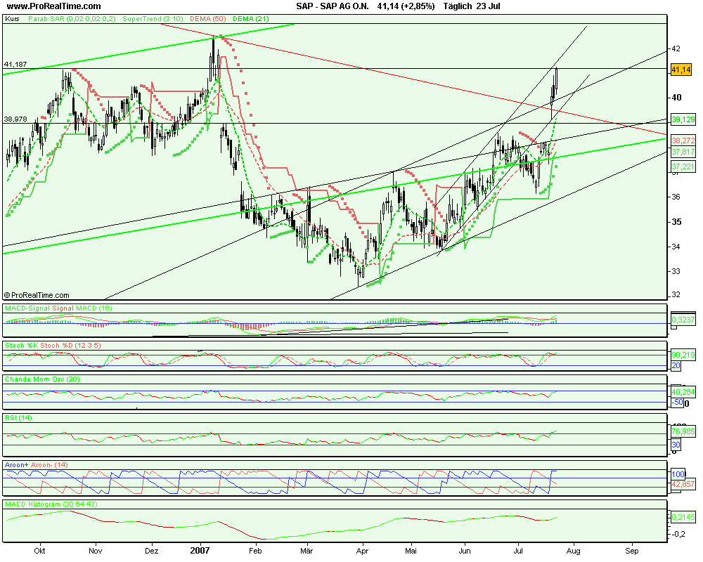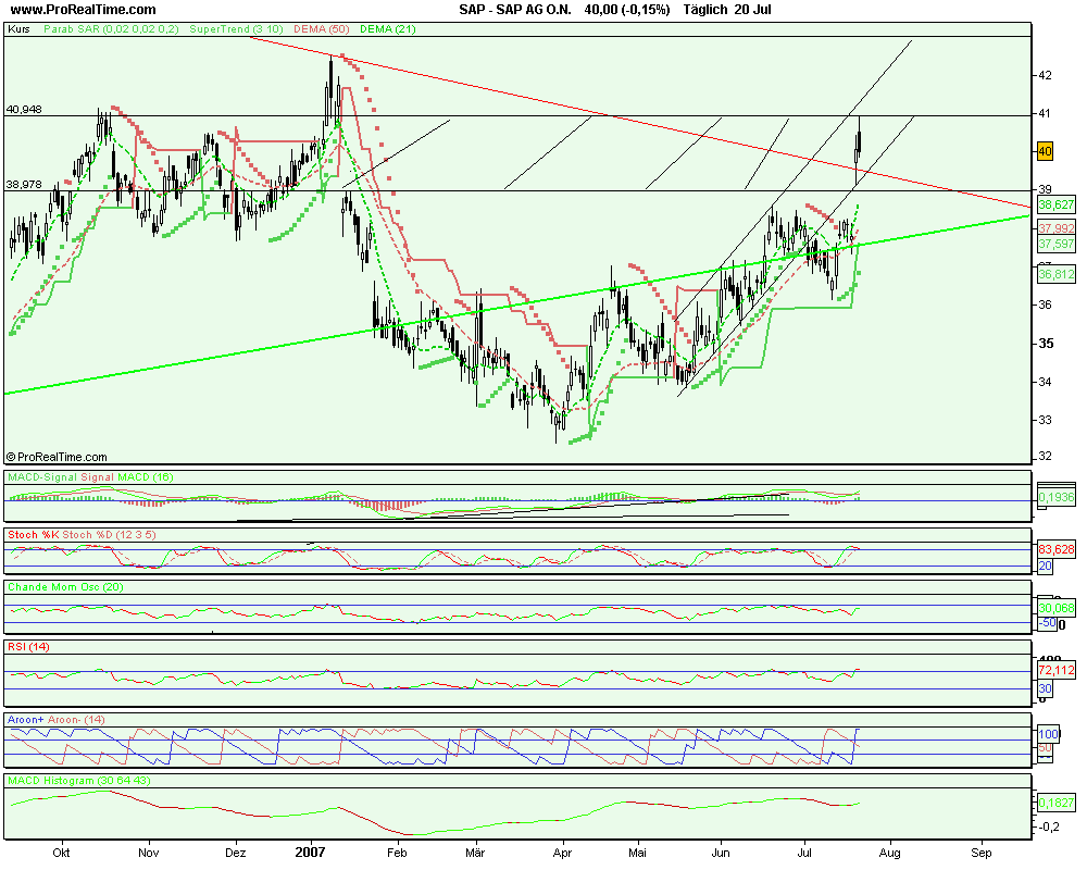 Nach den Zahlen befindet sich die Aktie nun bereits nahe der 40 Euro-Marke. Wie erwartet hatten die heiß diskutierten Personalquerelen keinen Einfluss auf das sehr gut verlaufende operative Geschäft. SAP-Boss Henning Kagermann berichtete von zweistelligen prozentualen Umsatzsteigerungen in allen Regionen - Europa, USA und Asien, wobei Asien mit einem Plus von 27 Prozent ganz klar der Wachstumstreiber ist.