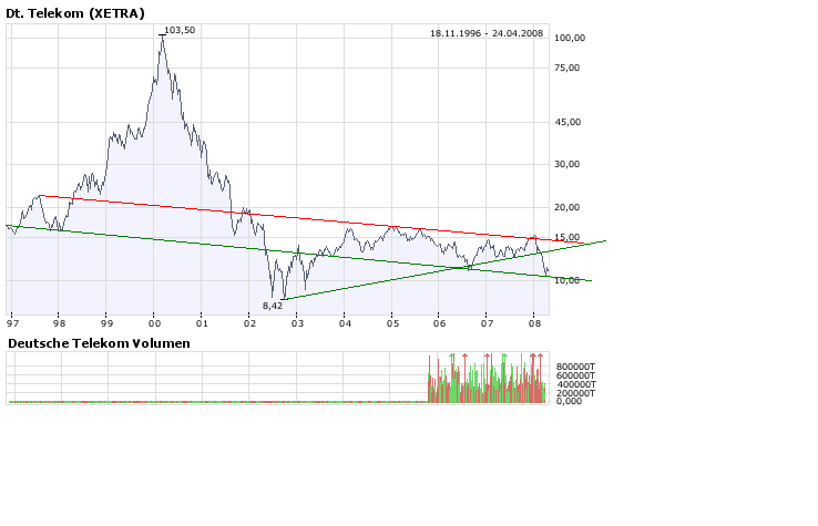 Der gesamt Dax fällt, nur die Telekom ist mit knapp 2% im Plus. Ohne die Telekom stünde der Dax wohl bei 6900 Punkten. Sollten heute oder am Montag Gewinnmitnahmen einsetzen, wird die Telekom den Dax wohl auf 6800 runterziehen...