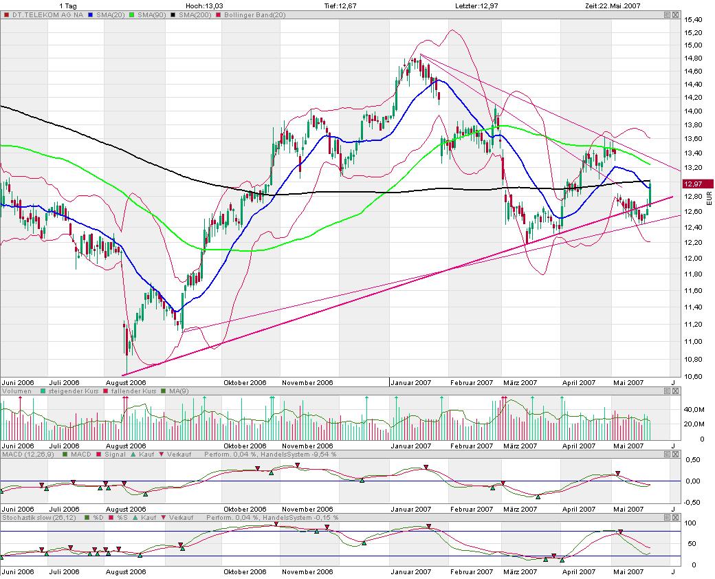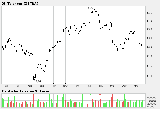 Zwar wurden schon quasi alle gleitenden Durchschnitte überwunden, aber die Aktie notiert gerade an einem wichtigen Widerstand. Erst bei einem Anstieg auf Tageschlusskursbasis über 13,50 Euro sehe ich weiteres Potential bis zunächst mal etwa 14,80 Euro. Die Dynamik des Anstiegs der letzten Tage lässt das gar nicht mal so unwahrscheinlich erscheinen, würde ich mal sagen. Prinzipiell ist aber auch ein erneuter Rückfall auf die innere Trendlinie bei derzeit etwa 11,70 Euro möglich. Mir aber alles relativ wurscht, hab wie gesagt das oben angesprochene Bonus-Zerti mit Barriere bei 10 Euro, und die wird die Aktie eben meiner Ansicht nach nicht mehr allzubald sehen (sowohl fundamental als auch charttechnisch)... :)