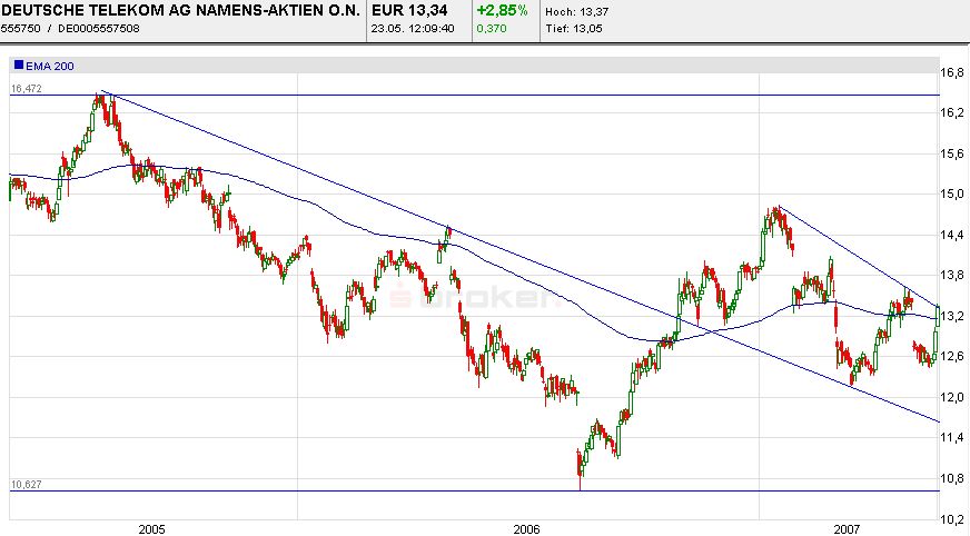 "Mit dieser Ankündigung bestätigt die Telekom unsere Einschätzung", sagte HVB-Analyst Thomas Friedrich. In den vergangenen zwei Quartalen habe sich das Bonner Unternehmen sehr stark im DSL-Markt präsentiert und dank der Führung unter Höttges einen guten Eindruck im Preiskampf hinterlassen. Friedrich empfiehlt die Aktien derzeit zum Kauf mit einem Kursziel von 14 Euro.