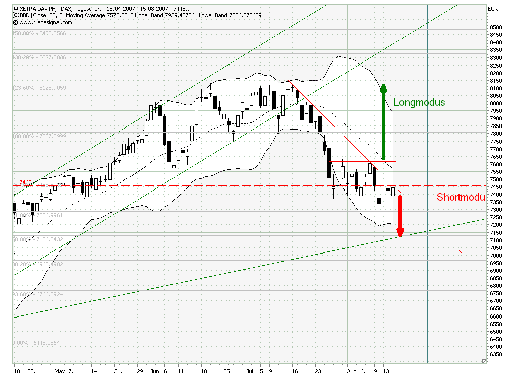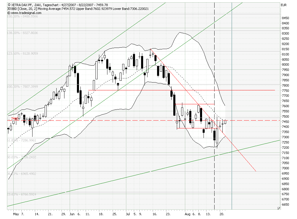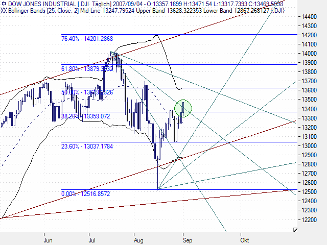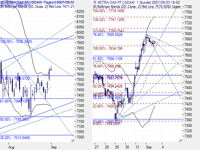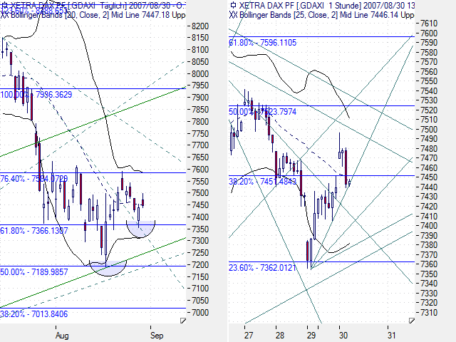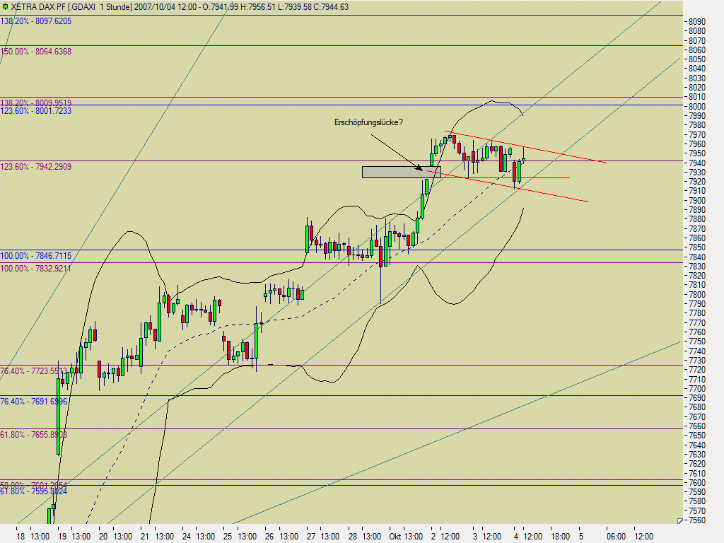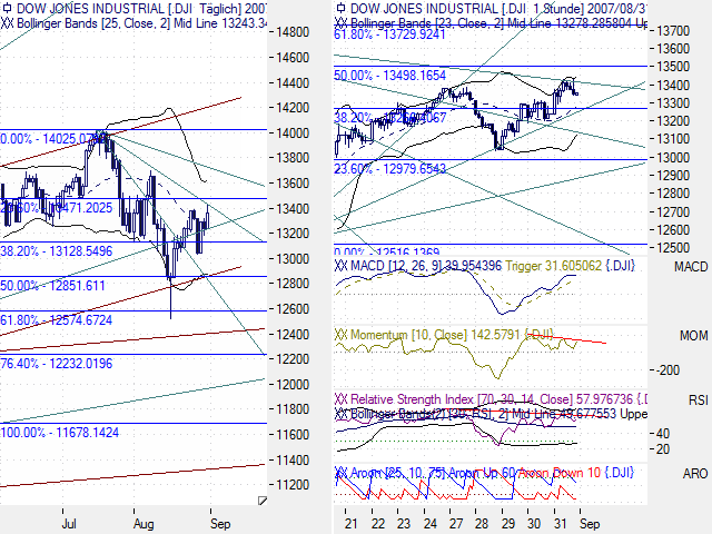 Moin. So weit hat es erst mal geklappt. DAX erreichte seine obere Bollinger Bänder. Die Werte neigen in einer Seitwärtsbewegung dazu, von einem Band zum nächsten zu laufen. Dass wir eine Seitwärtsbewegung zurzeit haben bestätigt auch AROON-Indikator. Nehmen wir an, dass DAX tatsächlich jetzt wenigstens zur Mittellinie des BBD in dem Tageschart gehen sollte, was spricht dafür? Nun schauen wir uns den Stundenchart (rechts) an. MACD gab heute dien ersten Verkaufssignal, Momentum fiel unter seine Aufwärtstrendlinie und RSI steht kurz davor. Wie wir wissen, kann ja immer noch Dow Jones über den Weg laufen und Short Position zu Nichte machen. Im Tageschart überquerte er gerade die Mittellinie des BBD, was eigentlich ein Bullensignal ist. Nur hängt er gerade zwischen zwei Angles. Eine Abwärtsangle, vom 17.07.07, was ein Widerstand darstellt und der Aufwärtsangle vom 18.07.06, die eine Unterstützung bietet. Also wird die nächste Kerze quasi entscheiden. Kann man jetzt schon sehen in welche Richtung? Eigentlich schon. Schauen wir einfach den Stundenchart (rechts) an. Hier erreichte DJ seine obere Bollinger Bänder, blieb an einer Abwärtsangle hängen und Momentum und RSI bilden wiederrum negative Divergenz zu dem Wert - bärische Zeichen. Gruß winsi