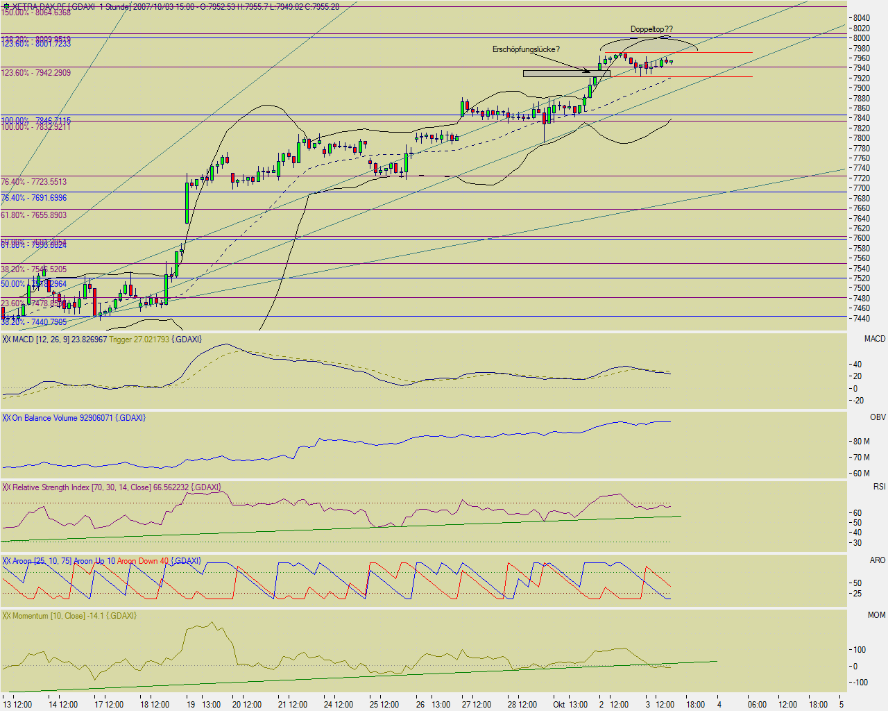 Moin. Lange nicht mehr geschrieben :-) Langsam wird spannend: im Tageschart abküllungsreife Indikatoren, im Stundenchart die ersten Verkaufssignale von Mom. und MACD, RSI bildet zwar hohere Tiefs, aber auch tiefere Hochs, gestern gerissener Gap, könnte auf Erschöpfungslücke hinweisen und vor allem drohender Doppeltop, was auch unter Umständen die Indikatoren bestätigen könnten. Gruß winsi