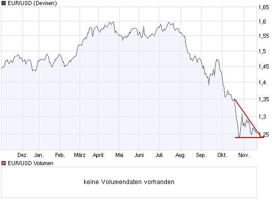 Euro unter Druck Der Druck auf den Euro hält an, da mit aggressiven Zinssenkungen durch die EZB zu rechnen ist. Zu Beginn der gestrigen US-Handelssitzung fiel der Euro erheblich, was auf wenig erbauliche Wirtschaftsdaten der Eurozone zurückzuführen war. Außerdem lassen die gestrigen Kursverluste am US-Aktienmarkt auf die derzeitige Stimmung unter Anlegern schließen. In dieser Situation profitieren vor allem Anlagen mit geringen Erträgen wie der US-Dollar und der Japanische Yen. Die europäischen Wirtschaftsdaten fielen uneinheitlich aus, aber sie sprechen insgesamt dafür, daß die Europäische Zentralbank ihre aggressiven Zinssenkungen bis zum Jahresende und im Jahr 2009 fortsetzen wird. Die Overnight Index Swaps von Credit Suisse preisen zurzeit 25 Basispunkte zugunsten von Zinssenkungen durch die EZB in den nächsten 12 Monaten ein. Der deutsche Großhandelspreis-Index fiel im Oktober, und das geschieht nun bereits seit 5 Monaten in Folge, so daß er nun ein Jahrestief von 3,6% erreichte. Angesichts der seit Juli fallenden Rohstoffpreise hat der weltweite Preisdruck etwas nachgelassen, wobei sich dies in den staatlichen Inflationsstatistiken wie beispielsweise dem deutschen Großhandelspreis-Index zeigt; der am Freitag erwartete Verbraucherpreisindex für die Eurozone wird dies wahrscheinlich ebenfalls belegen. Der viel beachtete deutsche ZEW-Konjunkturindikator zeigte eine leichte Verbesserung bezüglich der wirtschaftlichen Aussichten, aber der Index, der das Vertrauen in die gegenwärtige Wirtschaftslage reflektiert, ist auf ein 3-Jahrestief von -50,4 gesunken. Wichtige Wirtschaftsdaten für die Eurozone, die Kursbewegungen auslösen können, sind erst am Freitag zu erwarten, wenn der besagte Verbraucherpreisindex veröffentlicht wird. Allerdings könnte dieses Ergebnis durch das Bruttoinlandsprodukt für die Eurozone im dritten Quartal überschattet werden. Es wird nämlich wieder mit einer Schrumpfung gerechnet, was schon im letzten Quartal der Fall war. Diese Aussichten entsprechen der allgemeinen Definition für eine Rezession, was für noch aggressivere Zinssenkungen durch die EZB spricht. Die erwähnten Wirtschaftsdaten bergen ein erhebliches bearisches Potential für den Euro.