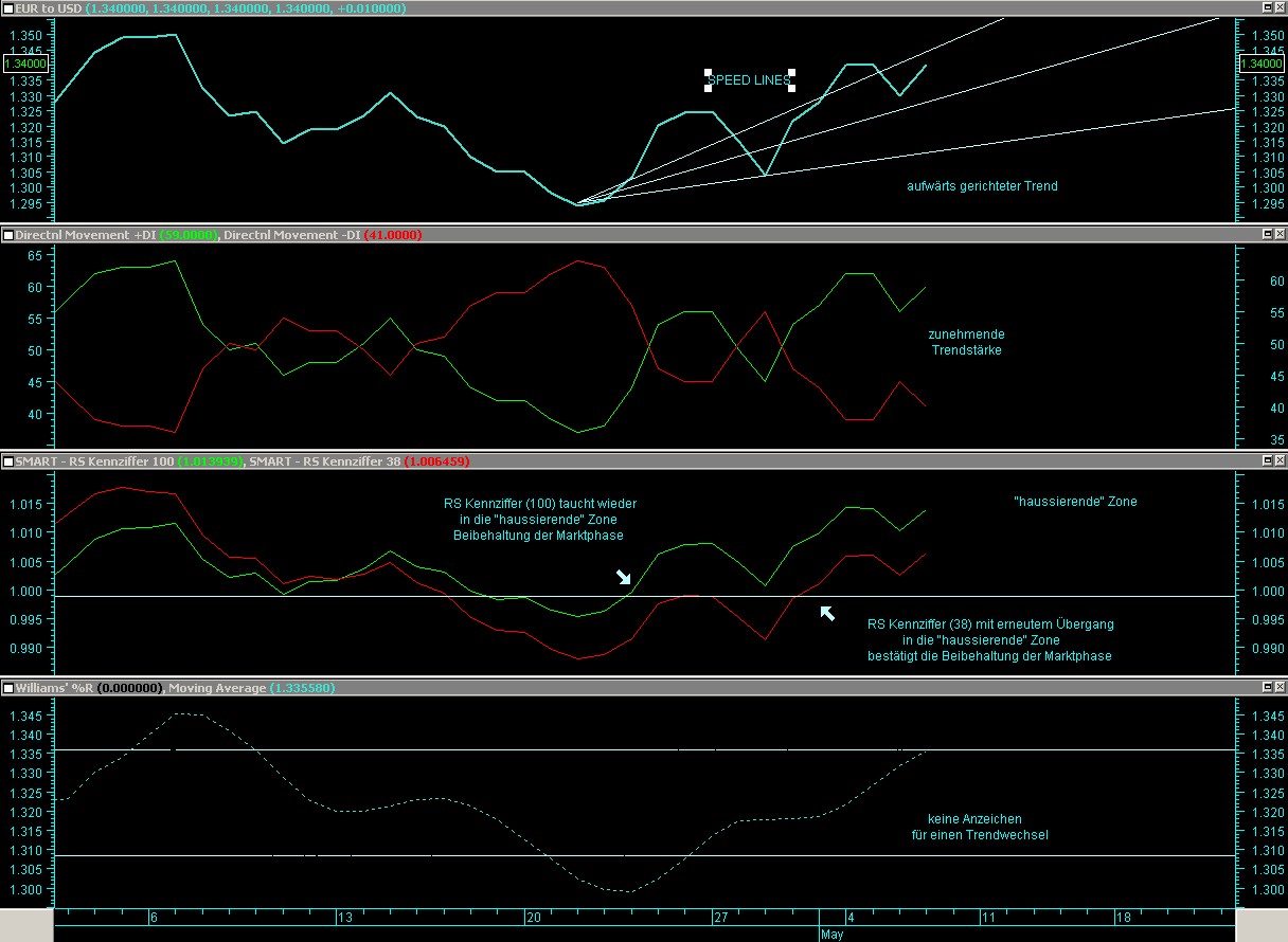 Die Eintrittswahrscheinlichkeiten von @Sonnenkind´s Erwartungen in den vorstehenden Postings sind charttechnisch gesehen hoch. Nach meinen charttechnischen Indikatoren bleibt der EUR/US$ deutlich aufwärts gerichtet, von möglichen kleineren Rücksetzern abgesehen. Auch der DMI zeigt einen sich verstärkenden Trend "nach oben" und nach den RS Kennziffern (38 und 100 Tage) ist der längerfristige schon seit 23.04. und der kurzfristige seit 29.04. in der "haussierenden" Zone. Auch der kfr. Moving Average (5) strebt der "überkauften" Zone zu. Alles in allem klare Anzeichen für eine Beibehaltung des aufwärts gerichteten Trends und für weiteren Kursanstieg.