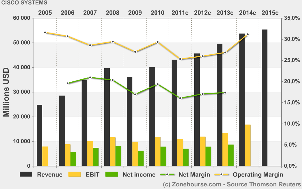 Seither hat Cisco Systems ca. 80 % an Wert verloren. Die Marktkapitalisierung liegt mit aktuell (2007) etwa 180 Mrd. US-Dollar jedoch nach wie vor recht hoch. Im Geschäftsjahr 2008 erwirtschaftete Cisco einen Rekordumsatz in Höhe von 39,5 Mrd. US-Dollar, bei einem Gewinn von 8,1 Mrd. US-Dollar. Seit dem 8. Juni 2009 ist Cisco am DJIA gelistet und somit in den wichtigsten Index der Welt aufgenommen. Cisco hat dabei den Platz von General Motors eingenommen.[2]