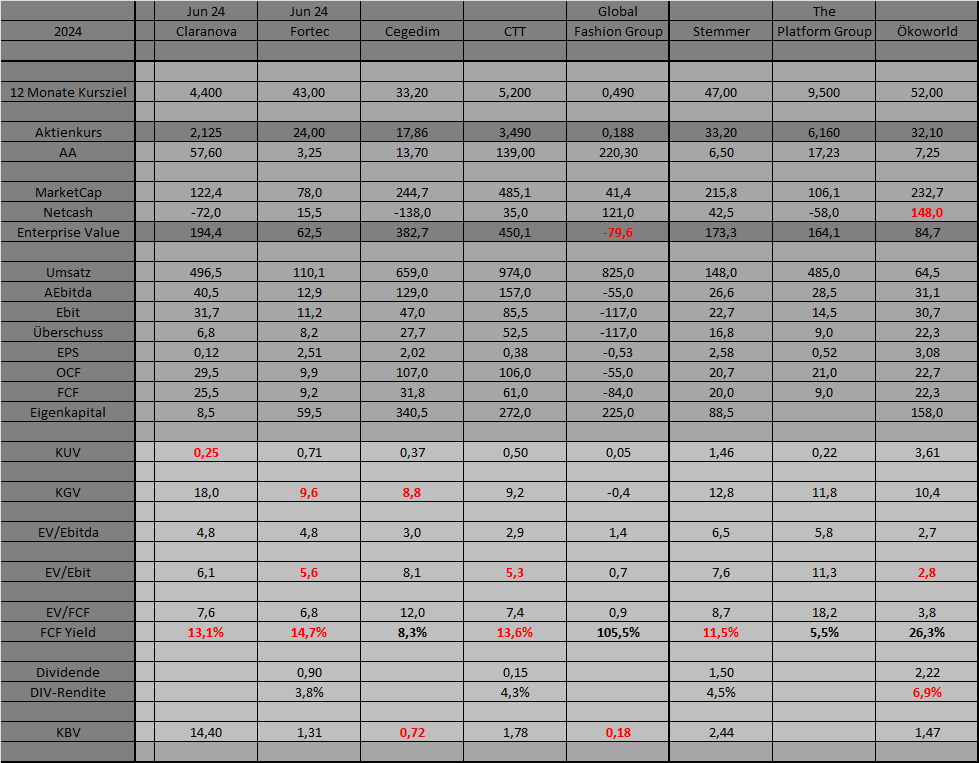 Generell wird es spannend werden, ob die starke Underperformance der Nebenwerte in Europa und den USA im neuen Jahr abbaut oder gar klar umgekehrt. Wenn man sich die Kennzahlen vieler Nebenwerte anschaut, egal ob gegenüber BlueChips (speziell den US Bug Tecs) als auch gegenüber den Anleiherenditen, dann müssten Nebenwerte über kurz oder lang deutlich outperformen. Ich setze deshalb derzeit vor allem auf Aktien, die nach FreeCashflow-Rendite stark unterbewertet erscheinen. In der Tabelle habe ich den FCF Yield einiger Aktien hevorgehoben, und ich werde das in den Postings zu den Einzelwerten noch genauer begründen. Wenn der breite Aktienmarkt aktuell mit FCF Yield von 6% und Staatsanleihen mit rund 4% notieren, erscheinen meine ausgewählten Aktien mit häufig um die 15% FCF Rendite sehr günstig. Gerade die bisher noch verschuldeten Aktien wie Claranova und Cegedim dürften beim FCF Yield zudem noch starke Hebel haben. Ich gehe da für die Geschäftsjahre 2025 dann schon von Renditen bei 20% bei Claranova und 15% bei Cegedim aus. Auch Fortec könnte sich auf 17-18% schrauben. Ich baue darauf, dass der Markt das letztlich in diesem Jahr erkennt. Manche der Unternehmen reagieren bereits mit Aktienrückkaufprogrammen, Sonderdividenden oder aber anorganischem Wachstum auf ihre Unterbewertung. Bei anderen erwarte ich solche Maßnahmen noch.