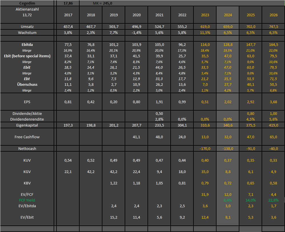 Wieso man dieses Potenzial bisher nie heben konnte, liegt an den starken Investitionen in noch kleine Wachstumsbereiche, die die Gewinne der letzten Jahre massiv belasteten. Insbesondere die Tochter Maiia tut sich mit über 20 Mio Verlust dabei hervor. Die Kernbereiche des Unternehmens arbeiten aber schon jetzt mit zweistelligen Ebit-Margen. Auch die NHS Verzögerungen in Großbritannien dämpften die Umsätze. Hinzu kamen immer wieder Sonderabschreibungen auf alte Übernahmen, insbesondere in den USA (Pulse), sowie zuletzt im 1.Halbjahr 2023 ein stark negativer Steuereffekt. Zudem kam es zu einem Vorlaufeffekt überproportional steigender Personalkosten im Zuge des gewonnenen Allianz-Großauftrags. Schafft man es in 2024/25 nur ein Drittel der Defizite in den Verlustsegmenten zu reduzieren, und auf Konzernbasis 6-7% zu wachsen (der Vorstand strebt 10% an), dürfte das Ebit im neuen Geschäftsjahr auf 47-50 Mio € steigen und 2025 weiter anziehen. Zielmarge muss im eingeschwungenen Zustand bei mindestens 10,5-11,0% liegen. Ich erwarte dieses Profitabilitätsniveau aber erst im Jahr 2026. Die Hebel auf den Konzerngewinn kann sich jeder selbst ausrechnen.