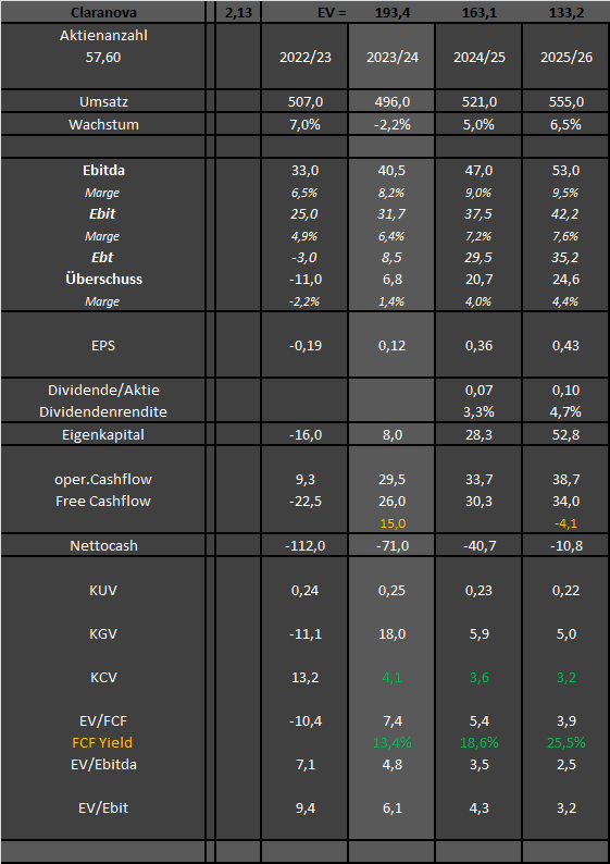 Fazit: Die ECommerce-Delle nach Corona, die Managementfehler bei Zukäufen und Fehlprognosen, sowie der Streit innerhalb der Aktionärsstruktur haben den Aktienkurs stark unter Druck gebracht. Hinzu kommen nicht cashwirksame Belastungen der GUV, die der Markt offenbar nicht als Sondereffekte deklarierte. Aus meiner Sicht sind große Teile dieser Belastungsfaktoren Vergangenheit und trotz eines nachvollziehbaren Bewertungsabschlages ist das Unternehmen schon jetzt deutlich an der Börse unterbewertet. Sollte sich meine noch immer vorhandene Skepsis durch schneller als von mir erwartete Margenverbesserungen schrittweise abbauen, und der Vorstand tatsächlich im aktuellen oder kommenden Jahr schon 10% Ebitda-Marge erreichen, würde die schnelle Entschuldung zu einem FCF Yield von 25-30% führen und damit erhebliches Kurspotenzial bis mindestens 6,5 € freisetzen. Aber da stecken eben noch so 1-2 „wenn“ und „aber“ drin. Die Q2-Zahlen in den kommenden Wochen könnten schon der Gamechanger sein. Sollte der Vorstand bei seinem Margenziel von 10% bleiben, dürfte es dem Markt auch egal sein, wenn PlanetArt dieses Geschäftsjahr aufgrund des schwierigen konjunkturellen Umfelds 5% an Umsatz verliert. Alle Aspekte zusammengefasst, ergeben sich für mich die Daten in folgender Tabelle.
