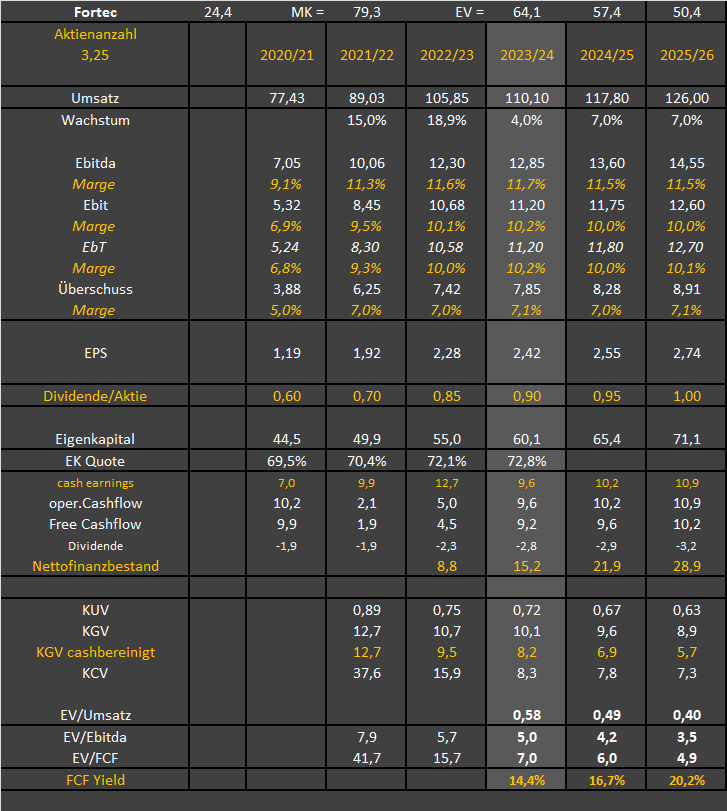 Im 1.Quartal ist man mit 6% im Umsatz gewachsen und hat die Ebit-Marge auf beeindruckende 13,3% steigern können. Die margenstarken Umsätze werden sich so zwar nicht halten lassen, aber die Voraussetzungen für das Erreichen des oberen Rands der Ebit-Prognose von 11 Mio € sollten dennoch sehr gut stehen. Aktuell arbeitet man nach Q1 mit einer EK-Quote von 74% und weist einen Nettofinanzbestand von 13,2 Mio € aus. Durch die auflaufenden operativen Cashflows und den im Normalfall niedrigen Capex sollte sich dieser Nettofinanzbestand bis zum Ende des Geschäftsjahres 2024/25 auf rund 22 Mio € erhöhen. Es sei denn man wächst bis dahin auch durch Zukäufe. Die letzte große Übernahme (Data Display) ist jetzt knapp 7 Jahre her und katapultierte Fortec in neue Umsatz- und Gewinnhöhen. Die bilanziellen Voraussetzungen sind heute vergleichsweise besser, weshalb ich davon ausgehe, dass Fortec ohne weiteres Wachstum von 25 Mio € Umsatz bei 3 Mio € Ebit zukaufen könnte, ohne sich überhaupt nennenswert verschulden zu müssen. Wie die abgesagte Übernahme aus dem letzten Jahr zeigt, geht der Vorstand aber sehr behutsam und vorsichtig vor, um strategische und finanzielle Risiken möglichst auszuschließen.