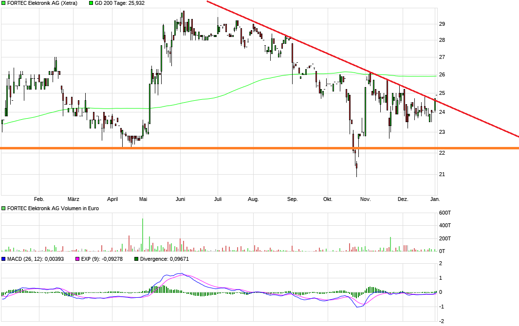 von meiner Seite vielen Dank. Hier hat mich als Investierter vor allem Fortec interessiert. ISt meine grösste Depotposition. Der Abwärtstrend scheint jetzt nachhaltig gebrochen. Aktuell wohl Backtest des Ausbruchsniveaus. EMA200 bei ~26€ noch nicht erobert. Kommt bestimmt noch ;-)
