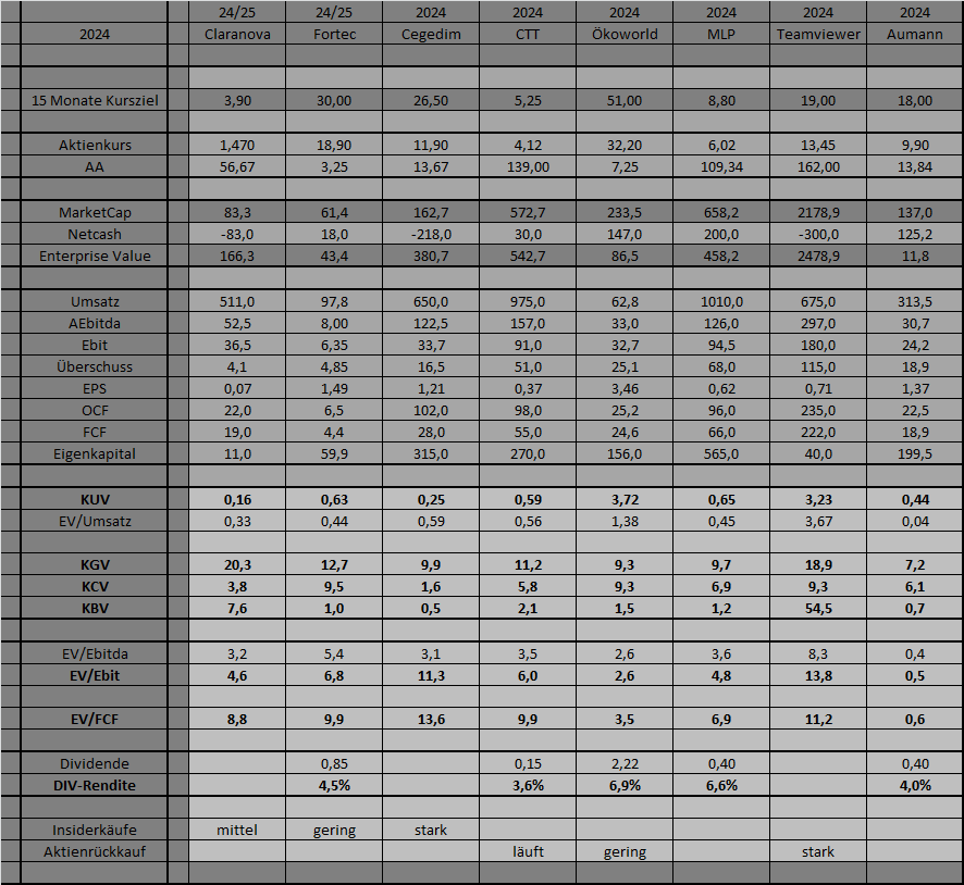 Ich werde in den kommenden Tagen dann noch mehr zu manchen Einzelwerten schreiben, um auch die Perspektiven der Unternehmen besser zu verdeutlichen. Eine Aumann wirkt in der Tabelle beispielsweise am günstigsten von den Kennzahlen, dürfte aber 2025 sehr deutlich an Umsatz und Gewinn verlieren. Aufgrund des hohen Nettocashs ist die Aktie aber ein klarer Kauf, auch wenn es charttechnisch betrachtet noch etwas tiefer gehen könnte. Eine Cegedim hingegen wirkt in der Tabelle vielleicht am "teuersten", aber dürfte 2025 deutliche Gewinnsteigerungen sehen und dann ebenfalls auf sehr günstige Kennzahlen kommen.