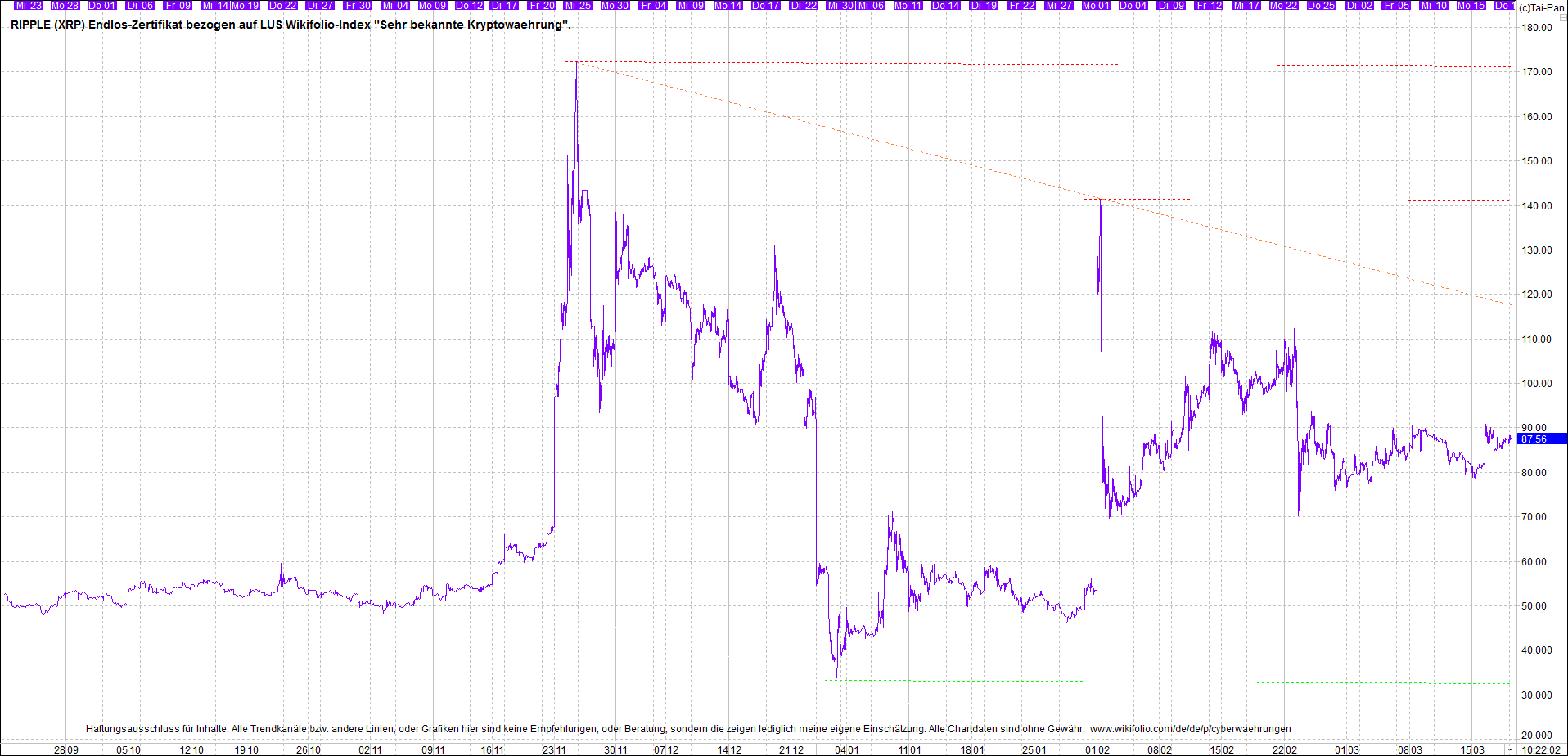 Das dazu passende Ripplezertifikat, ist bekannt als: Endlos-Zertifikat bezogen auf LUS Wikifolio-Index "Sehr bekannte Kryptowaehrung".