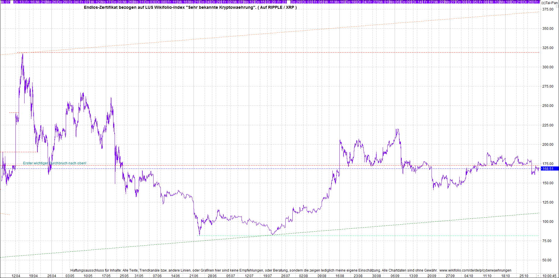 Das dazu passende Ripplezertifikat, ist bekannt als: Endlos-Zertifikat bezogen auf LUS Wikifolio-Index "Sehr bekannte Kryptowaehrung".